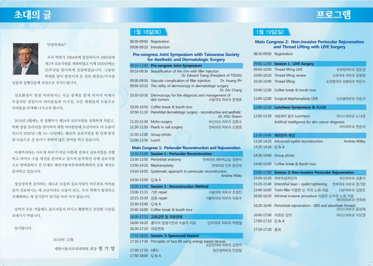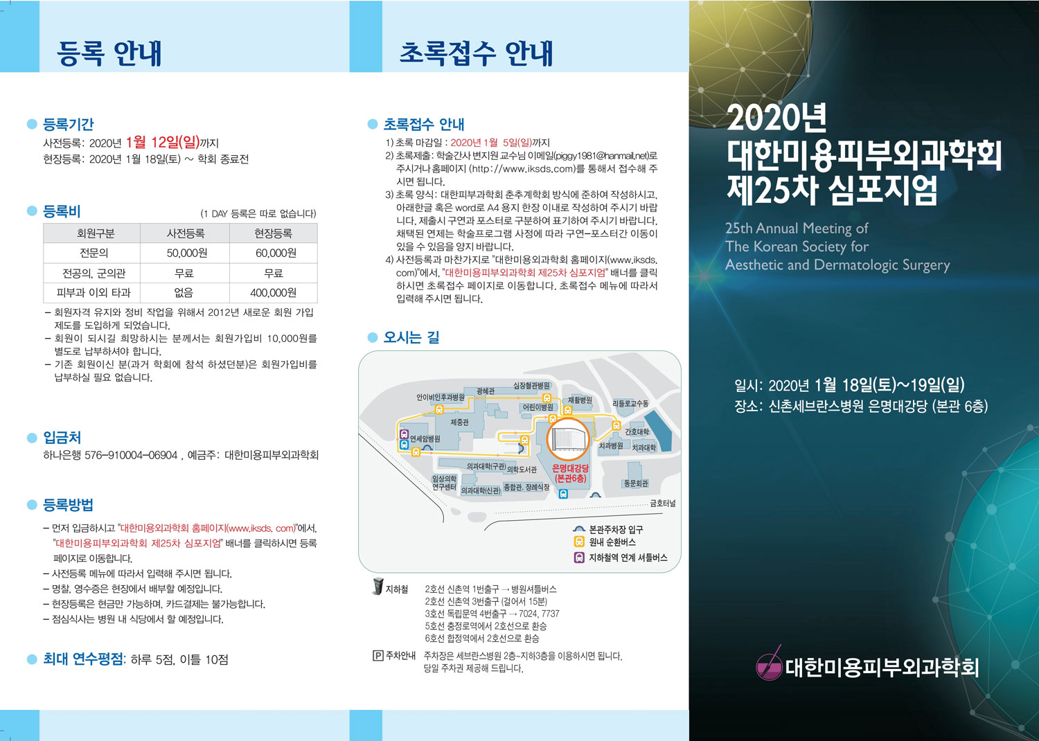 2020년 제 25차 대한피부외과학회심포지엄 (Joint symposium with Taiwanese Society for A… 최고관리자 0 2330 2019.12.16 11:48 http://ksds2020.com + 132 2020년 제 25차 대한피부외과학회심포지엄(Joint symposium with Taiwanese Society for Aesthetic and Dermatology Surgery)